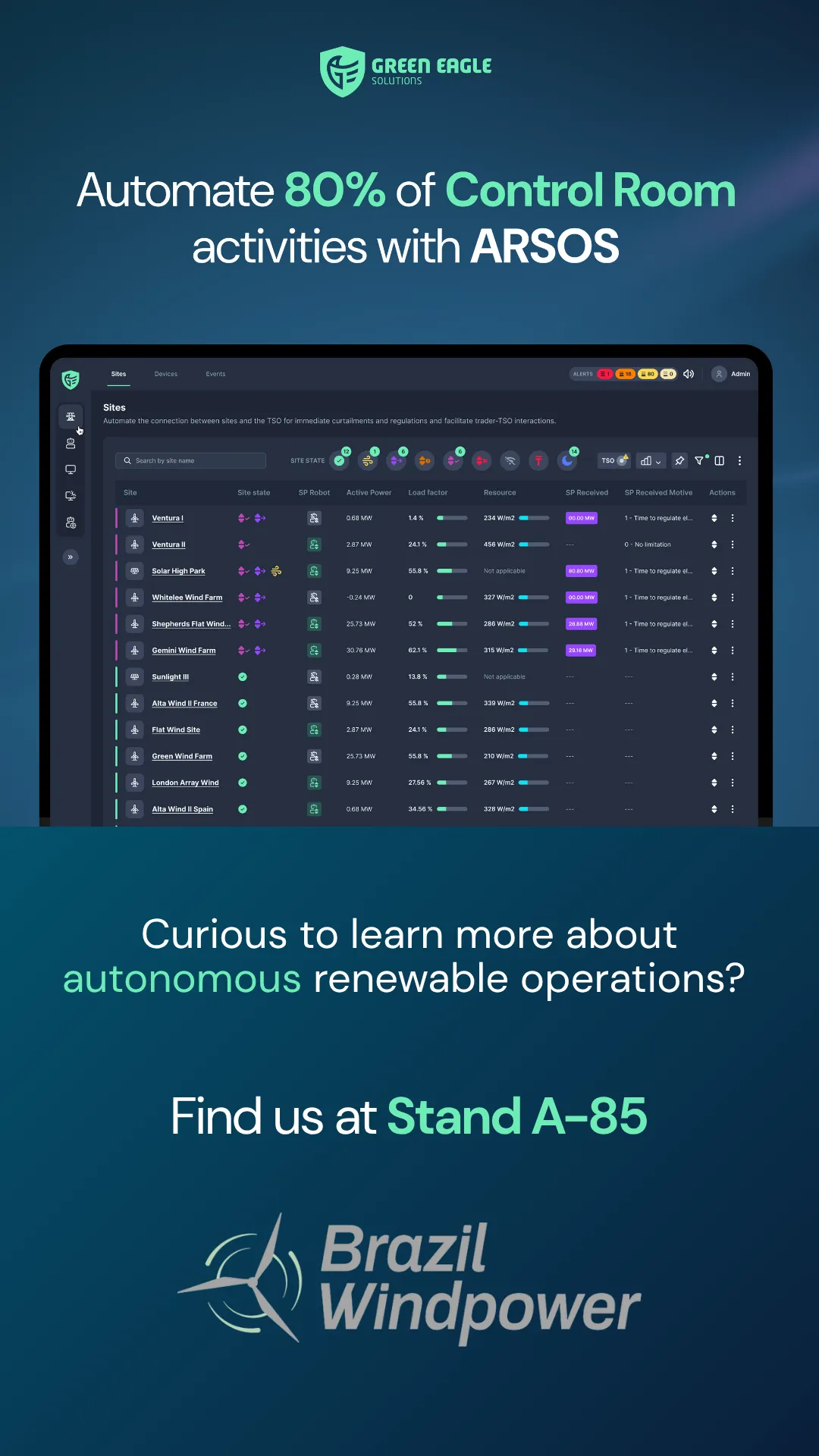 Founded in Spain in 2012, with headquarters in Madrid and Seville, Green Eagle Solutions accelerates the path to fully autonomous renewable energy operations through ARSOS, our SaaS Automation Suite.