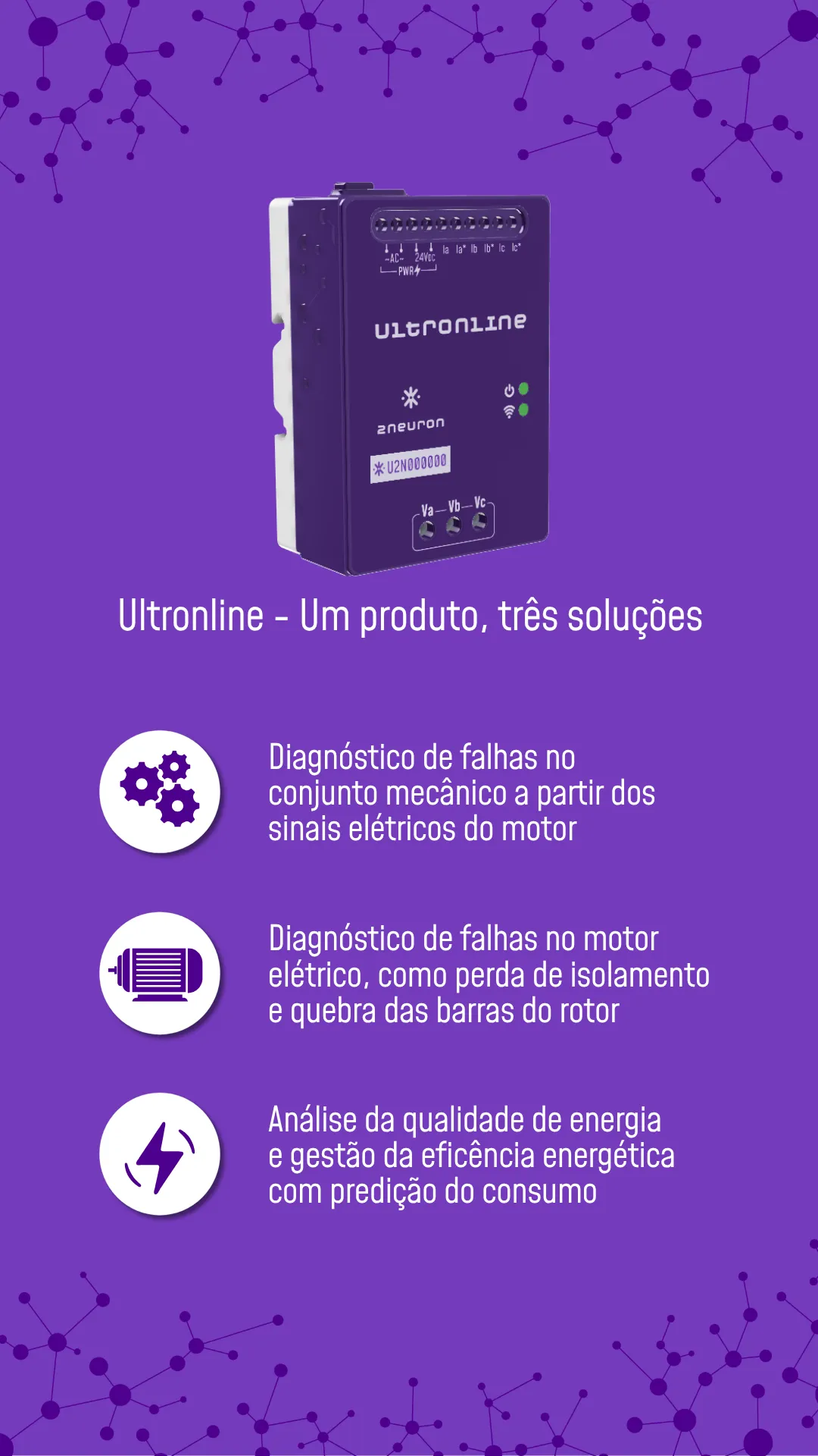 Um produto, três soluções: diagnóstico de falhas mecânicas, diagnóstico de falhas no motor elétrico e análise de eficiência energética.