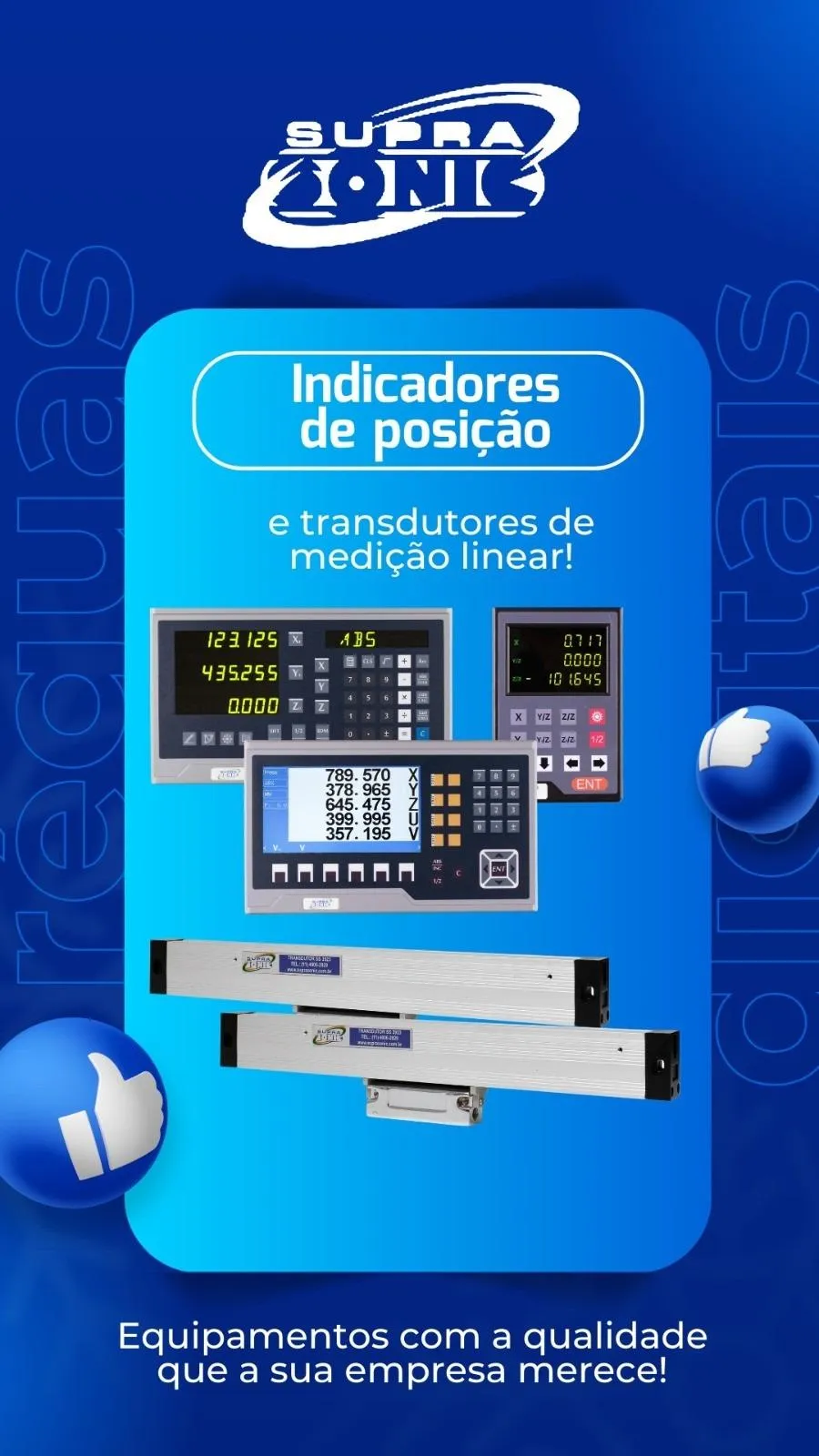 Fundada em 1985 a empresa Suprasonic Eletrônica vem positivamente ao longo de décadas de experiência contribuindo com o mercado brasileiro de máquinas. Nossa linha de produtos é continuamente atualizada, agregando maior variedade, qualidade e confiabilidade em nossos produtos. Atendemos em todo o território nacional, com técnicos preparados e treinados para oferecer a melhor relação custo-benefício, sempre visando o melhor negócio para o cliente. Os nossos produtos são: Indicadores Digitais de Posição, Transdutores Óptico Lineares, Eletroerosão CNC, Eletroerosão por Penetração, Eletroerosão Por Corte a Fio (Molibdênio), Eletroerosão Por Corte a Fio (Latão), Acoplamentos, Encoders e outros.